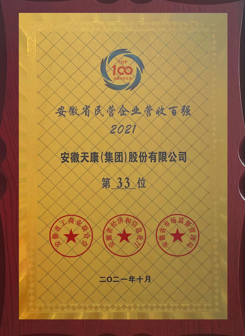 10月21日,2021安徽省民营企业百强发布会在阜阳隆重举行。会上发布了2021安徽省民营企业营收百强、制造业综合百强和服务业百强榜单,安徽天康集团荣获2021安徽省民营企业营收百强、制造业综合百强,连续16年上榜。